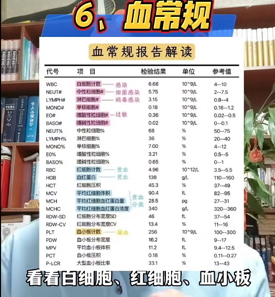因為如果高血壓同時合并了同型半胱氨酸升高那么腦梗的風險就會增加。所以很有必要對高血壓的人來講,查一個同型半胱氨酸。血糖血脂100個人中就有10個糖尿病的人數(shù)據(jù)來源《中國血脂管理指南》。長期高血脂糖尿病,如果沒有得到有效的控制,會增加血管堵塞的風險,所以我們要查一查我們的血脂四項,查一個空腹血糖。也沒必要做一個生化全套。意義不是很大。高尿酸容易引起痛風。也會增加心血管疾病的風險。尿酸一般在這個腎功能當中,順便查一下肌酐、尿素氮、電解質(zhì)、鉀鈉氯。肝功能的簡項,肝功能也有很多種,查相對比較簡單的,別整太多的。最后就是差血常規(guī),看看白細胞、紅細胞、血小板看看有沒貧血也就足夠了。其實就是抽兩管血,這也是最基礎最重要的幾個檢查項目。